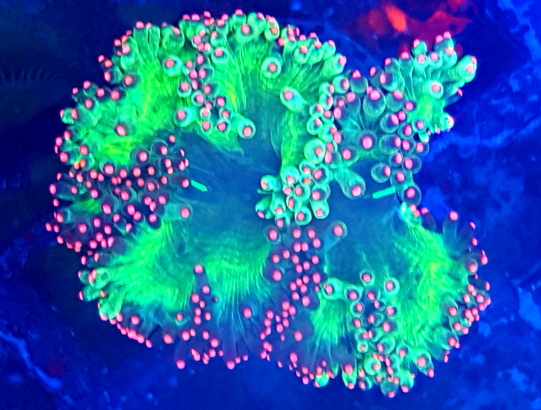 - Różowe końcówki polipów pod niebieskim światłem fluorescencyjnym przyciągają uwagę i tworzą wyjątkowy efekt wizualny.