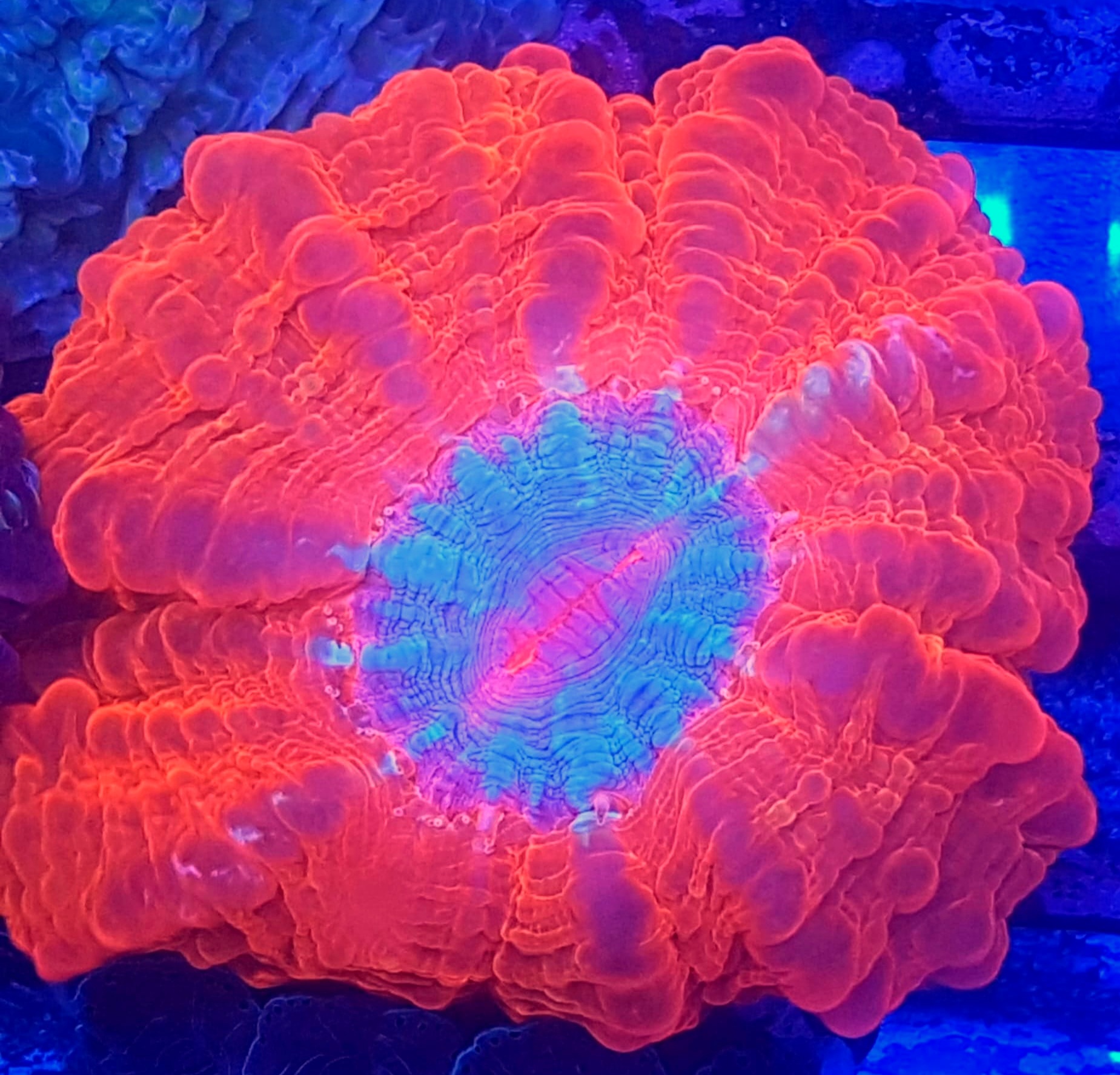 Cynarina Red-Blue to niezwykle efektowna odmiana koralowca LPS, wyróżniająca się intensywnym połączeniem głębokiej czerwieni z chłodnymi, niebieskimi refleksami. Monumentalny, mięsisty polip oraz metaliczna struktura barw sprawiają, że jest to jeden z najbardziej pożądanych koralowców pokazowych w akwariach rafowych klasy premium.